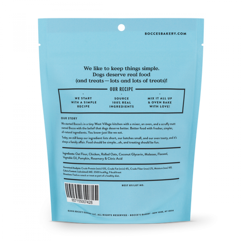 Bocce is a 5 year old mutt with one scruffy hairdo and a tail that won’t stop wagging! At a doctor’s checkup, Bocce’s was told that he was carrying a few extra pounds. Oh my! So I started looking into what he was eating. I was shocked with the amount of preservatives, and ingredients that I had never heard of in his food ...and treats. We decided to make a change. I combined my love of cooking using organic, seasonal ingredients, with Bocce’s love of biscuits. And Bocce’s Bakery was born! We’ve come up with all-natural biscuits, in delectable flavors, all doggies are sure to love. Still baked by hand, in small batches, with the freshest ingredients we can find. We hope you enjoy our treats. Andrea & Bocce