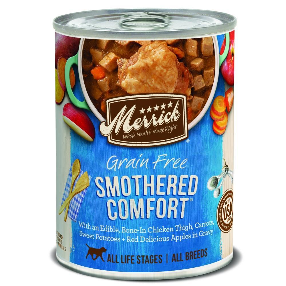 Merrick Classic Grain Free Smothered Comfort Canned Dog Food brings all of the tasty favorites from southern classics right to your dog’s bowl. Merrick Classic Grain-Free Smothered Comfort Canned Dog Food features whole, slow cooked chicken thighs for a soft texture that can be easily broken apart by hand or fed whole! This grain free classic is packed with protein, with large chunks of chicken smothered in gravy that any dog is sure to love! As with all of Merrick’s recipes, it's made with real, farm fresh ingredients and contains no artificial colors, flavors, or preservatives.